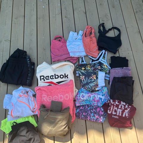 Selger 3 treningstrøyer, 3 tights og 3 gensere samlet for 150,-