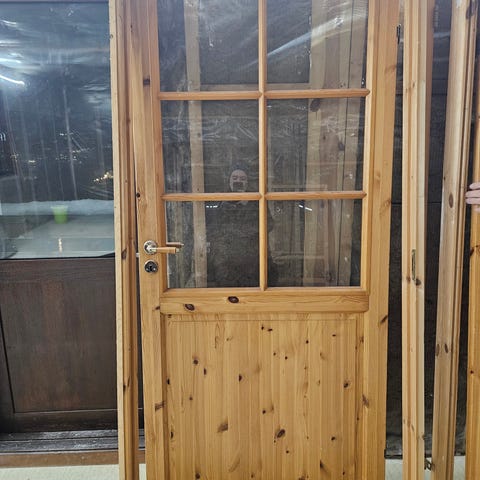 Selger samlet 2 stk ubehandlet furudører, en med og en uten karm. Dørene selges samlet. målene 70x190 cm (fysisk målt 72x194, karm yttermål 79,5x199,5),. Døren er laget av furutre og egner seg til innvendig bruk. Har stått montert på hytte.