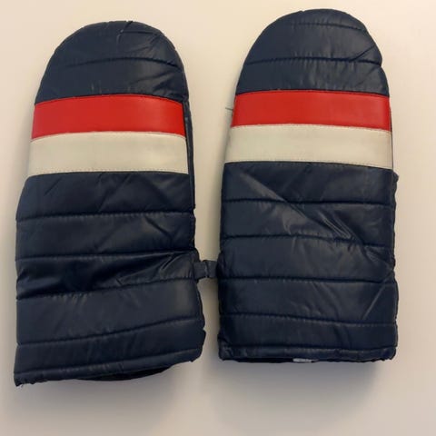 Votter i tettystoff tror jeg. Myke Fra rundt 70. Pent brukt, og godt tatt vare på ser jeg. De har vært mine, og mor har tatt vare på de. Nå som hun er borte rydder jeg opp.