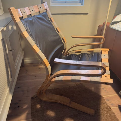 Siestastol, pent brukt, sjelden utgave. Lite sår på pute, kan fikses. Nypris: stol 13000.- krakk 10000.-