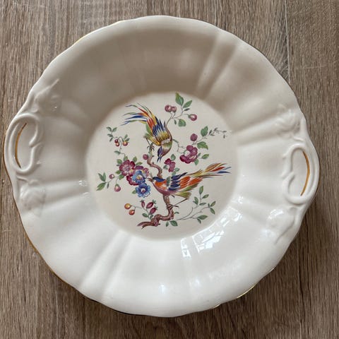 Serveringsfat. Kakefat. Engblomst. Med gullkant. 29 cm lengde og 20 cm bredde