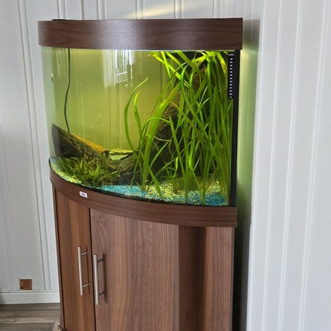 Akvarium med hjørneskap i tre og glass