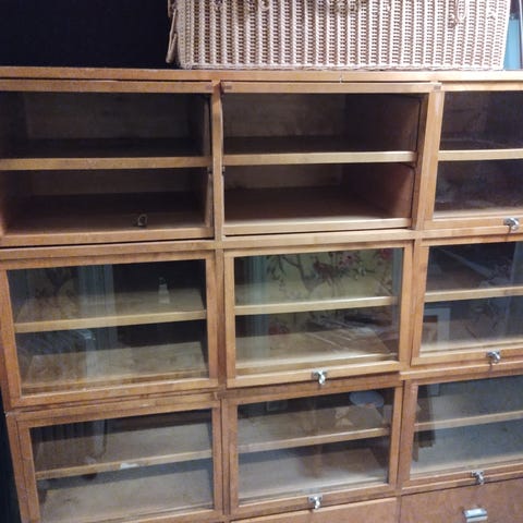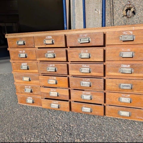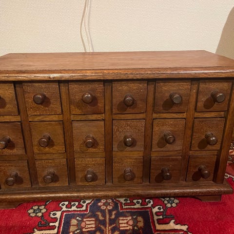 Trivelig, sjarmerende kjøpmannsdisk/kommode i lakkert furu med messinghåndtak selges. 24 skuffer som er hele og glir lett. Innvendig mål på skuffene er 37 x 21 cm.