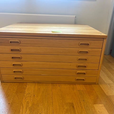 Den har stått i en barnehage i mange år og har derfor veldig mange bruksmerker. Men er hel og fin, alle skuffer fungerer og kan tas helt ut, alle håndtak sitter fast.