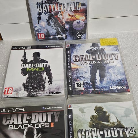 Spillpakke for Playstation 3 som inkluderer flere titler: Call of Duty 4 Modern Warfare, Call of Duty Black Ops, og Battlefield. Spillene har ulike aldersgrenser og dekker sjangere innen action og skytespill.
