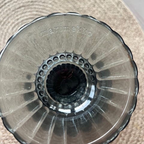 Iittala Marimekko glasskål i klart glass. Skålen har et klassisk design med dekorative mønstre og en fot. Egnet til servering eller dekorasjon.