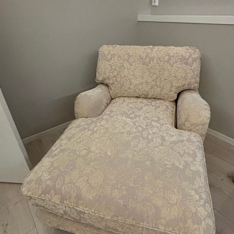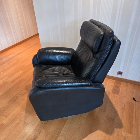 Lenestol i sort «skinn», svingbar, og fotstøtte. Hel, et lite merke på armlene. Men fungerer fint
