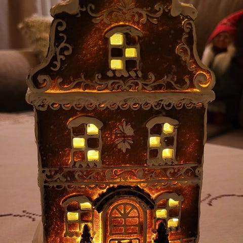 Pepperkakehus med lys.Utrolig søt og kan settes sammen ned nisser - julepynt