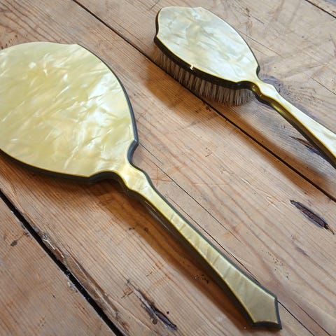 Rikt dekorert fot, såpekopp komplett med innlegg og speil med dekorert bakside