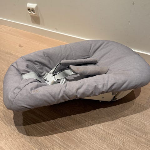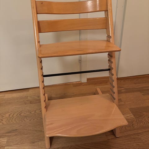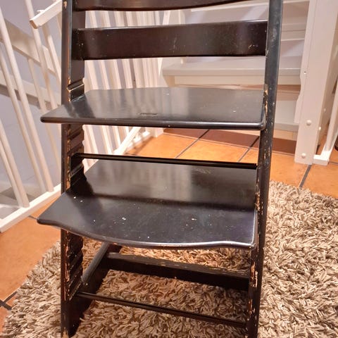 Stokke barnestol i svart farge. Stolen er laget for barn og har en solid konstruksjon. Noen bruksmerker og riper er synlige, spesielt på bena.