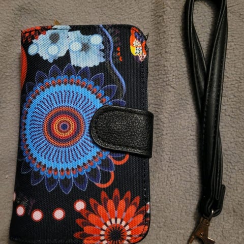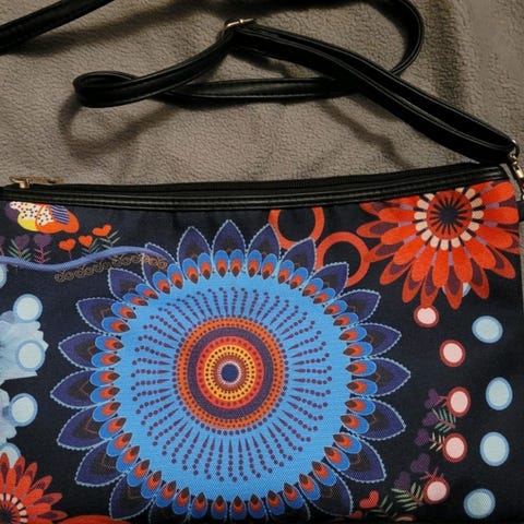 Stor veske/tote bag med flerfarget, mandala-lignende blomstermønster, forskjellig mønster på hver side. Flat stivet underside som gjør at vesken står på egenhånd. Vesken inneholder to store rom adskilt med en stor lomme på midten som lukkes med glidelås.