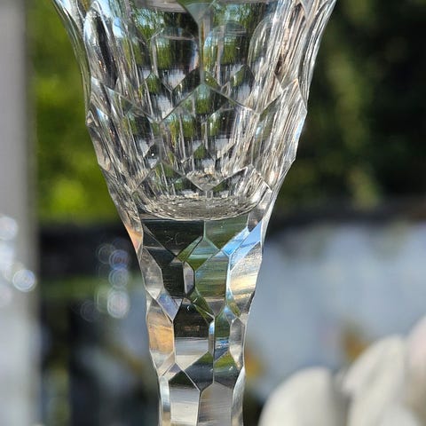 Ukjent merke krystallglass dramglass i sett på 4 stk. Glassene har en høyde på ca. 12 cm og en diameter på ca. 5 cm. Gjennomsiktig materiale med fasettert design på bollen. Egnet for servering av drikkevarer