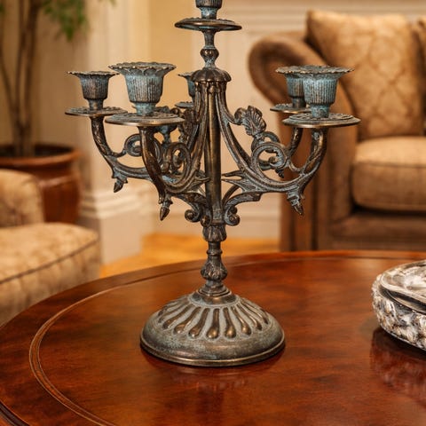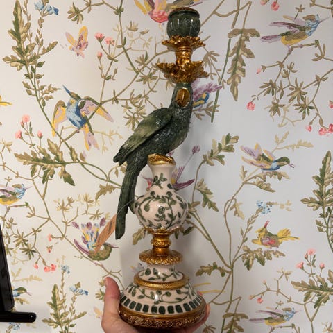 Hvis du liker interiør som er litt "too much", så vil jeg tro at du liker denne herligheten her av en lysestake! Den er laget i polyresin og metall. Lysholdere har nydelig blå holdere med gulldekor, fuglen sitter på en gren og det er en knopp og en blomst på staken. Kikk også på foten - nydelige detaljer! Lysestaken er håndlaget - sånn som denne kan ikke lages i masseproduksjon (laget i Østen).