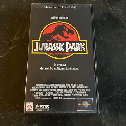 Sjelden Jurassic Park VHS-kassett med originalemballasje. Inneholder filmen Jurassic Park med tilhørende cover og reklameinnlegg.