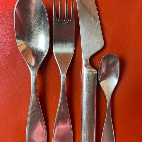 IKEA Bestikksett i rustfritt stål bestående av kniv, gaffel, spiseskje og teskje.