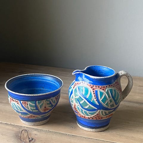 Krusene har dekor med hest og hane, mens krukken har et vakkert blått/grønt båndmønster. Alt er håndlaget og signert under.