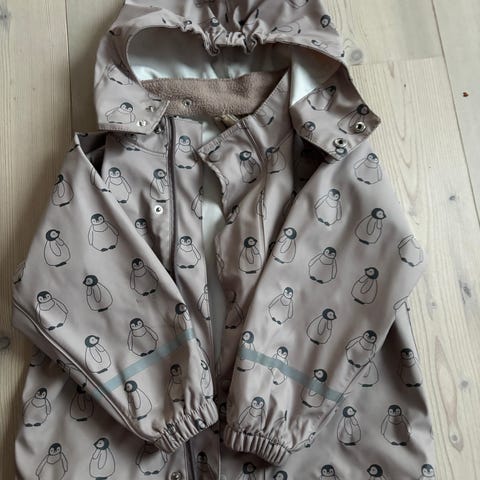 Pent brukt regnjakke. Ser ut som et liten penneflekk på hetta, se nest siste bilde. Noe slitasje på innsiden av jakken forran ved halsen, se bilde