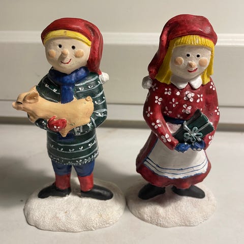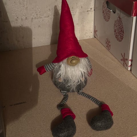 Nissegutt laget av gips dekorert med rødt tøy og rød lue. Figuren har stripete skjorte og står på en grønn base. Er laget som lysestake. 23 cm høy .
