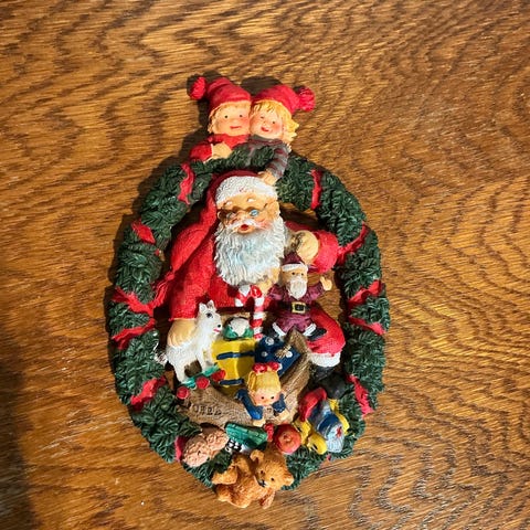 Sjarmerende musikkboks (spiller 'I wish you a Merry Christmas'). Den ringen med bamser bever seg rundt. Pent brukt. H ca 17cm. Ø ca 16cm.