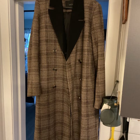 Vintage kåpe av ukjent merke og størrelse med ullining (ingen merkelapp). Jeg er selv en størrelse M. Hemp til belte, men følte ikke med når jeg kjøpte den brukt.