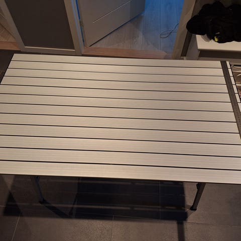 Allsidig og lett å ta med på tur. Sammenleggbart bord med fire krakker som lagres inne i bordet når det er slått sammen. Bordet har aluminiumsramme og bordplate i MDF. Krakkene har sete i tekstil. Bordets maksimale belastning er 40 kg, og krakkene tåler samlet opptil 110 kg.