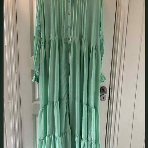 Finstrikket kjole fra Map med høy hals og fine detaljer med gullfargede knapper nederst på ermene.