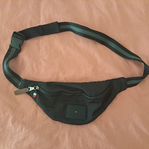 unisex veske laget av andre materialer. Vesken har flere rom med glidelås, justerbar stropp og en nøytral farge.