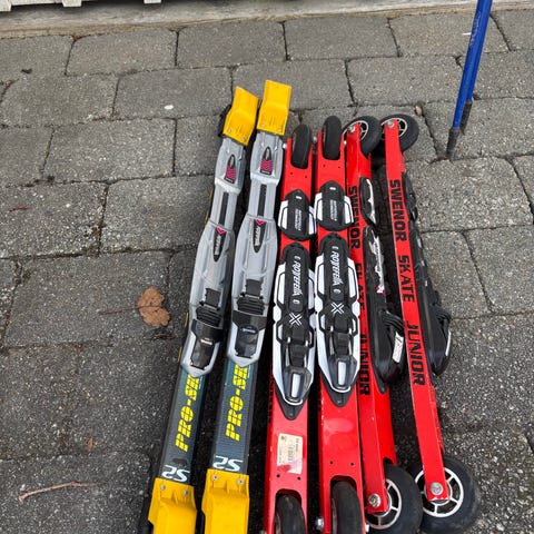 Gode rulleski for barn og jr. Godt brukt, men mye igjen av hjulene. Lengde 53 cm (ytterpunkt til ytterpunkt).