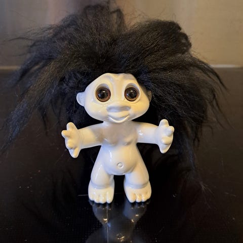 Thomas Dam Troll Dukke med blondt hår. Figuren har en karakteristisk design med store øyne og håndformet hjerte.