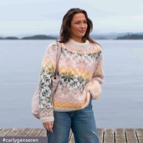 Carly gensere i flerfarget alpakkaull, str. M for dame. Genseren har et mønster i flere farger og er strikket i myk alpakkaull som ikke klør, men gir varme og komfort.
