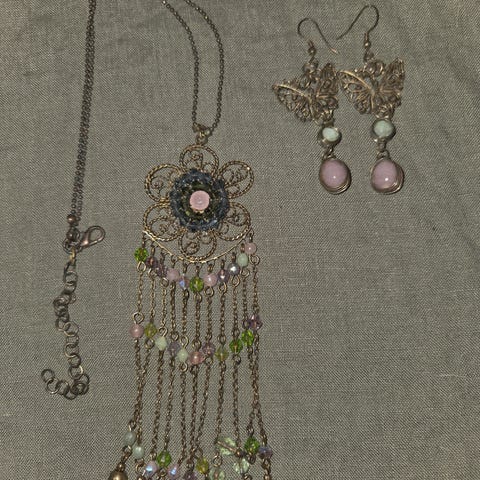 Halskjede, samlet, halskjeder, kjeder, smykker, halssmykke, øredobber, ørepynt, farger, blomst, blomster, emalje.