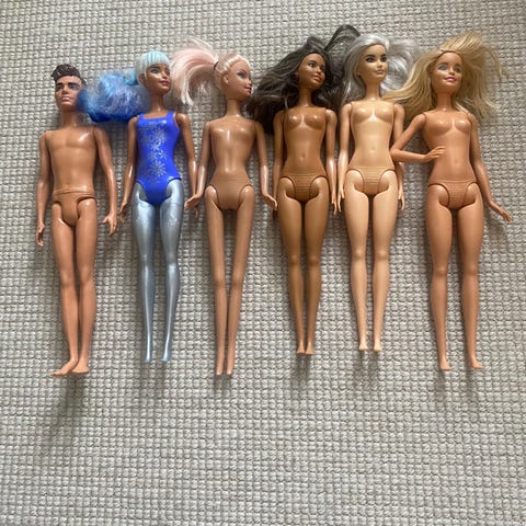 Assortert sett med Barbie dukke klær og tilbehør inkludert blått skjørt med blonder topp og truse blått toppsett med blomsterdetaljer, Rød og hvit Klovnedrakt.røde og hvite stripete.Materialer inkluderer syntetiske tekstiler. Passer til dukker.