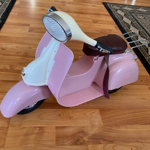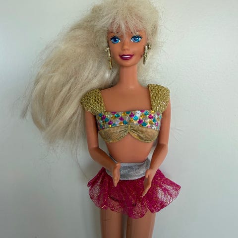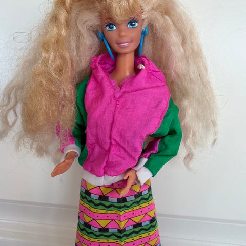 Barbie dukke i antrekk inkludert rosa på armer og rundt halsen og lilla topp med sølv bukse, Håret kan justeres til å vri på skalpen til å bli blondine fra lilla.Dukken med varierende hårfarger og stiler.