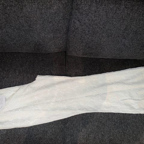 Lommer i siden, jukselommer bak, glidelås i siden og sydd press. Hvid passform.