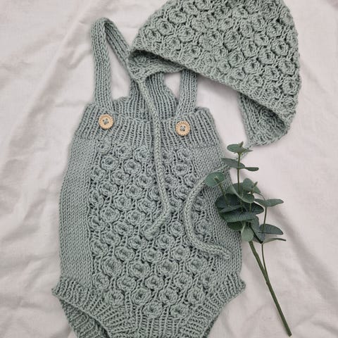 Nye, hjemmestrikkede romper i myk merinoull (Drops Daisy, lys nougat og brun).