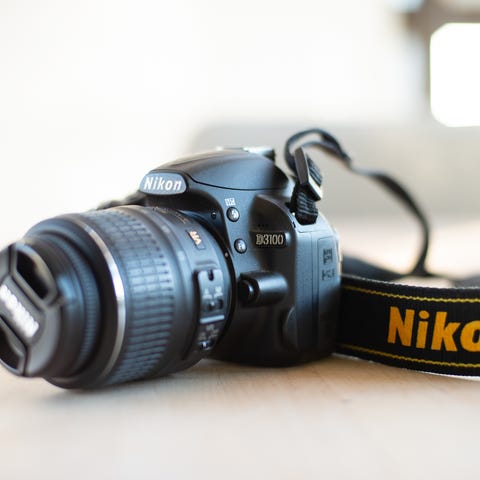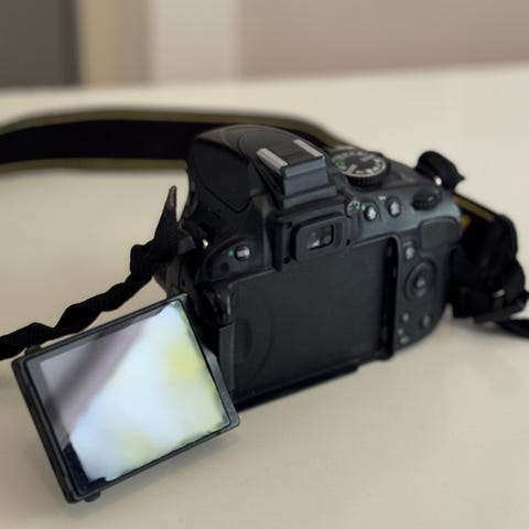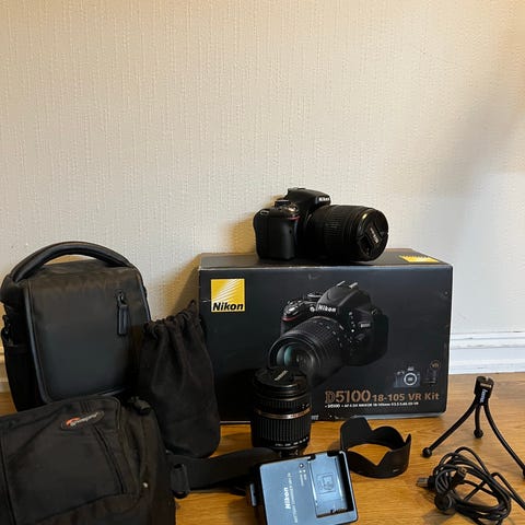 Nikon D5100 digital speilreflekskamera med utskiftbart objektiv. Kameraet har en varivinkel LCD-skjerm som kan vippes og dreies, og tilbyr høy bildekvalitet for fotografering i ulike situasjoner.