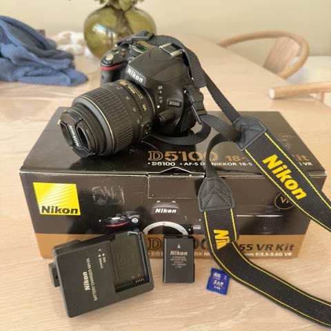Medfølger lader, orginalbatteri, to objektiver: VR Nikon DX, AF-S Nikkor 18-55 mm 1:3,5-5,6 G og Nikon DX, VR, AF-S Nikkor 55-300 mm 1:4,4-5,6 G ED og LowPro Bæreveske.