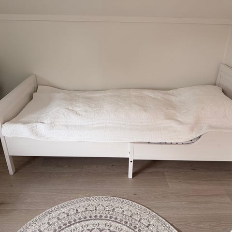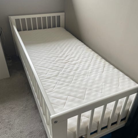 Seng med madrass. I god stand. Noen få små merker på sengen, se bilder. Ikke av betydning. De små merkene ved hodeenden syns ikke uansett når man har pute der..Trekk til madrass kan tas av(glidelås), slik at det kan vaskes( Er norn merker på dette trekket).