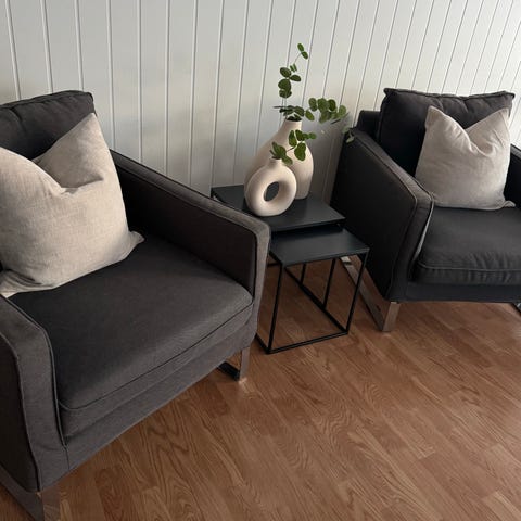 2 stk lenestoler i mørkgrå. De er kjøpt på Skeidar i 2009/20010, så de er brukt en del men fortsatt i god stand. De er ikke så store, men letter å flytte rundt på og gode å sitte i.