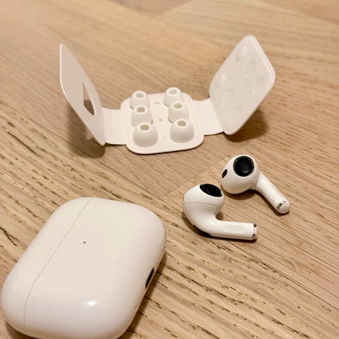 Alt følger med: ladeetui, USB-C ladekabel, originale silikonpropper og original eske.
