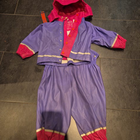 Reflex regntøysett i størrelse 86, designet for jenter. Sett består av jakke med hette og bukse, laget av polyester materiale. Fargen på plagget er rosa med mørke detaljer.