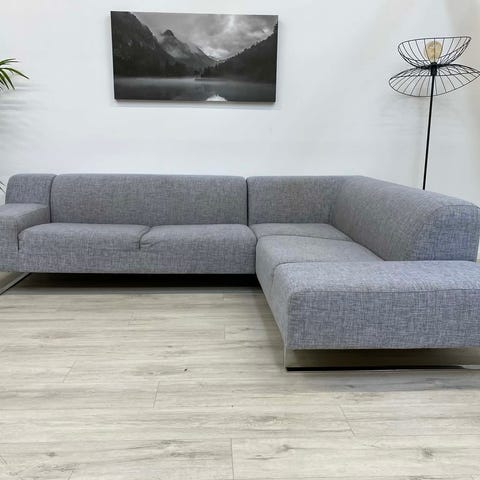 Eksklusiv Bolia Seville – en sjelden modell som ikke lenger er i produksjon. Sofaen er kjent for sitt moderne, lave uttrykk, brede armlener og de ikoniske polerte metallbena som gir hele rommet et high-end preg.