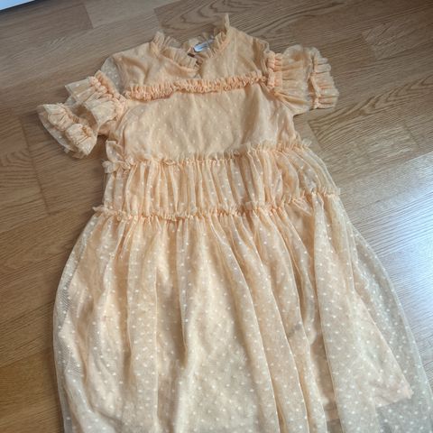 Fint brukt kjole fra name it i str 146. Fin lilla grunnfarge med blomstrer og noen gullfarget deltaljer. Har prøvd å få det frem på bildet.