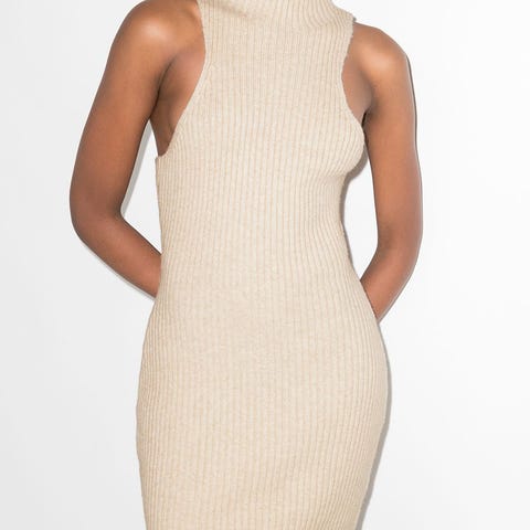 Design: Kjolen har en elegant og kroppsnær (bodycon) eller skjedekjole-silhuett som rekker til omtrent midt på leggen (midi-lengde).