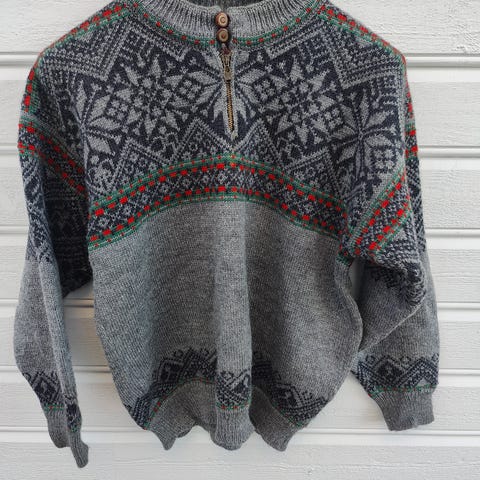 Tjukk ull genser, norskprodusert, brukt et par skiturer, nesten ny. Passer både str L eller som en baggy str M . Hadde sagt dette er en unisex genser både for dame og herre, eller barn