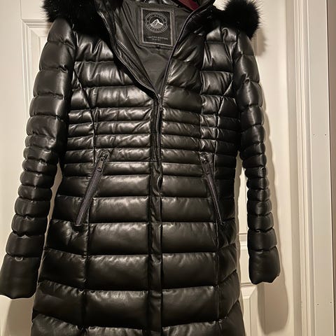 Meget pen og lett dunkåpe m glidelåslukking og knapper. Avtagbar hette m skinnkrage. Innvendig lomme m glidelås. 2 ytre lommer. God størrelse 38. Jeg bruker 40/42 og kåpa passer i lengde