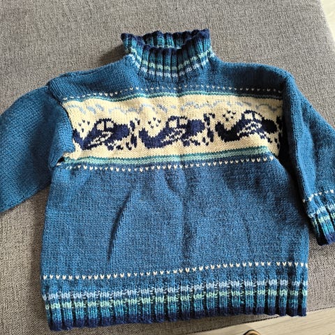 Pent brukt, hjemmestrikket ullgenser. Passer ca størrelse 1-2 år