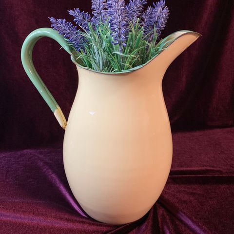 Gamle emaljerte ting selges. Vaskevannsfat i emalje. Flotte til blomster på hytta.
