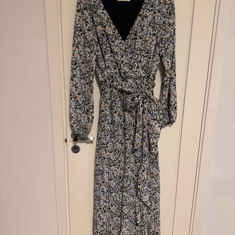 Glamorous hverdagskjole i størrelse 36. Kjolen er svart med et blomstermønster og laget av polyester. Den har lang erme og en omslagsdesign med knyting i siden.