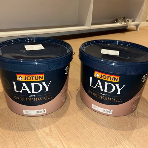 Jotun Lady veggmaling i flere spann med ulike farger og størrelser. Inneholder også maling fra Nordsjø og Butinox, egnet for innendørs bruk på vegger. Materiale og eksakte farger varierer mellom spannene.